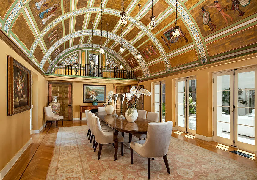 The roughly 10-acre property includes a four-bedroom mansion designed in the early 1900s by architect Bertram Goodhue for wealthy New Yorker James Waldron Gillespie, The Wall Street Journal has reported. It incorporates Roman and Middle Eastern influences, including a Byzantine-style “conversation room” with a fountain and a high-domed ceiling. A dining room has a barreled ceiling painted in 24-karat gold leaf and depicting a scene of Alexander the Great conquering Persepolis. There is also a roof deck with views of the Pacific Ocean and the Channel Islands, as well as two guest cottages with an additional three bedrooms.